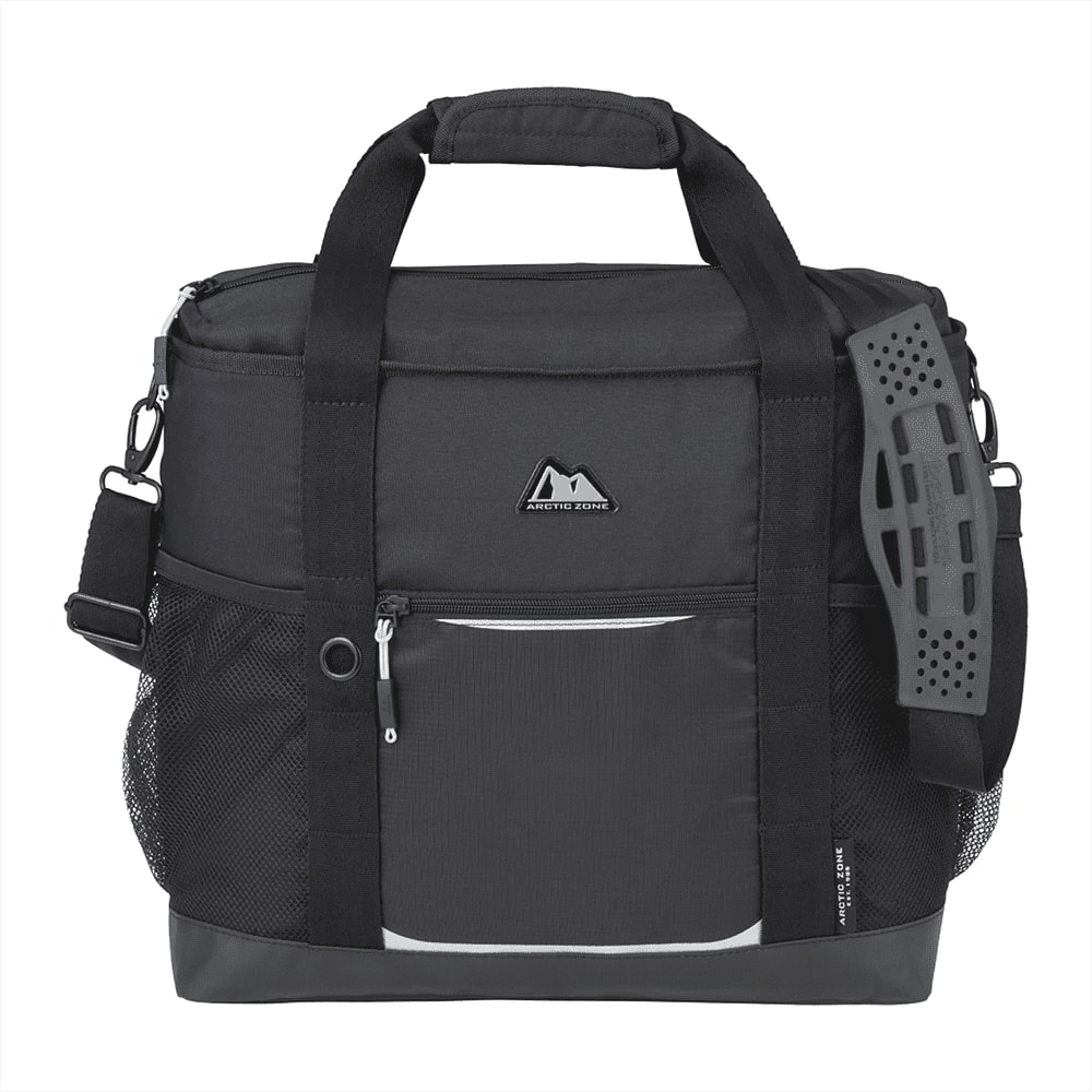 The Arctic Zone 30 can crib cooler features a sturdy, PEVA lining that keeps contents cold and prevents leaking. The cooler is easily portable with an adjustable shoulder strap and grab handles. The Ultimate Sport Cooler can hold up to 30 cans with a zippered main compartment, two side mesh pockets, and a front zippered pocket.
