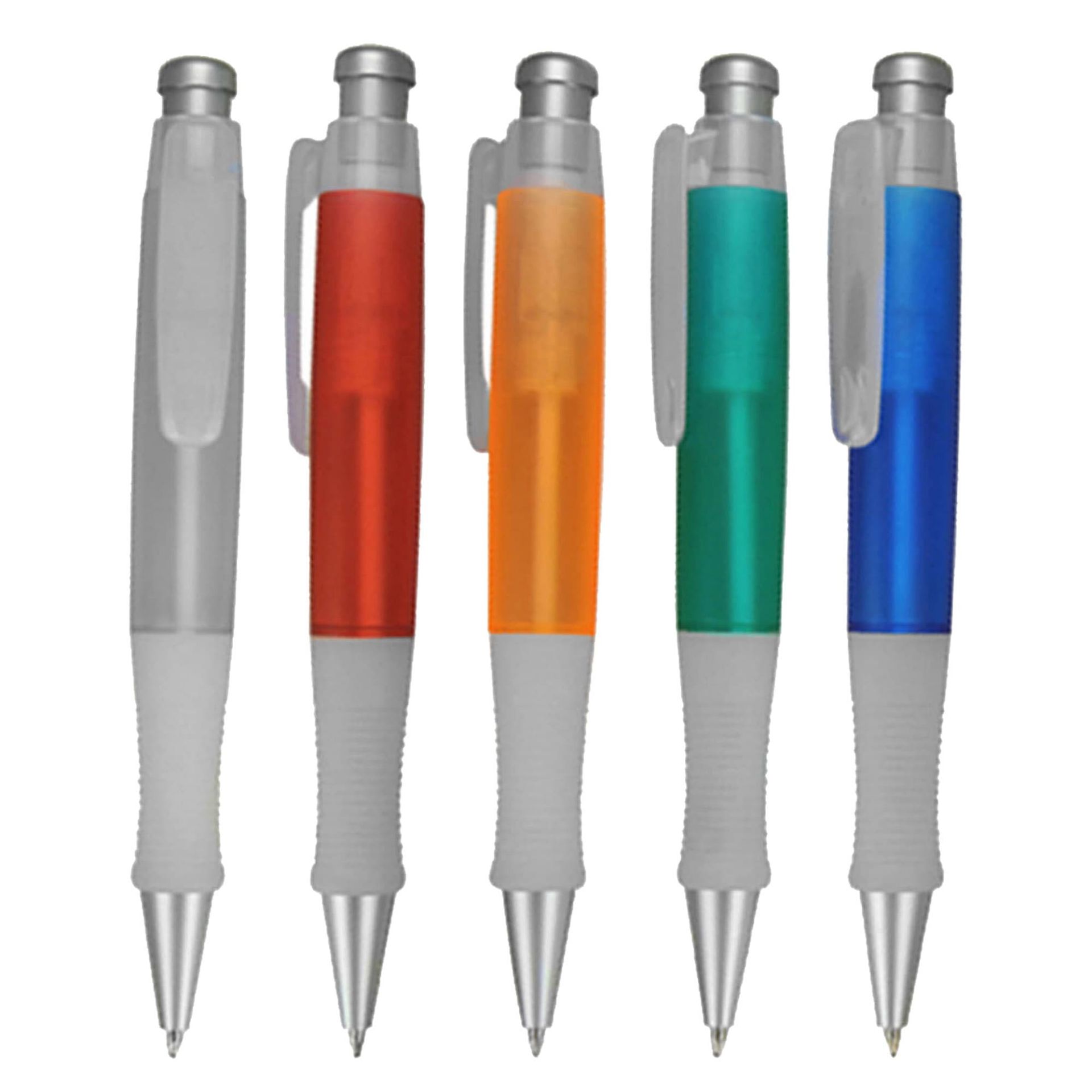 Click action plastic pen translucent coloured body with white rubber grip and matt silver fittings high quality German manufactured black ink refill 1800 meters writing distance tungsten carbide ball provides you with quality writing.