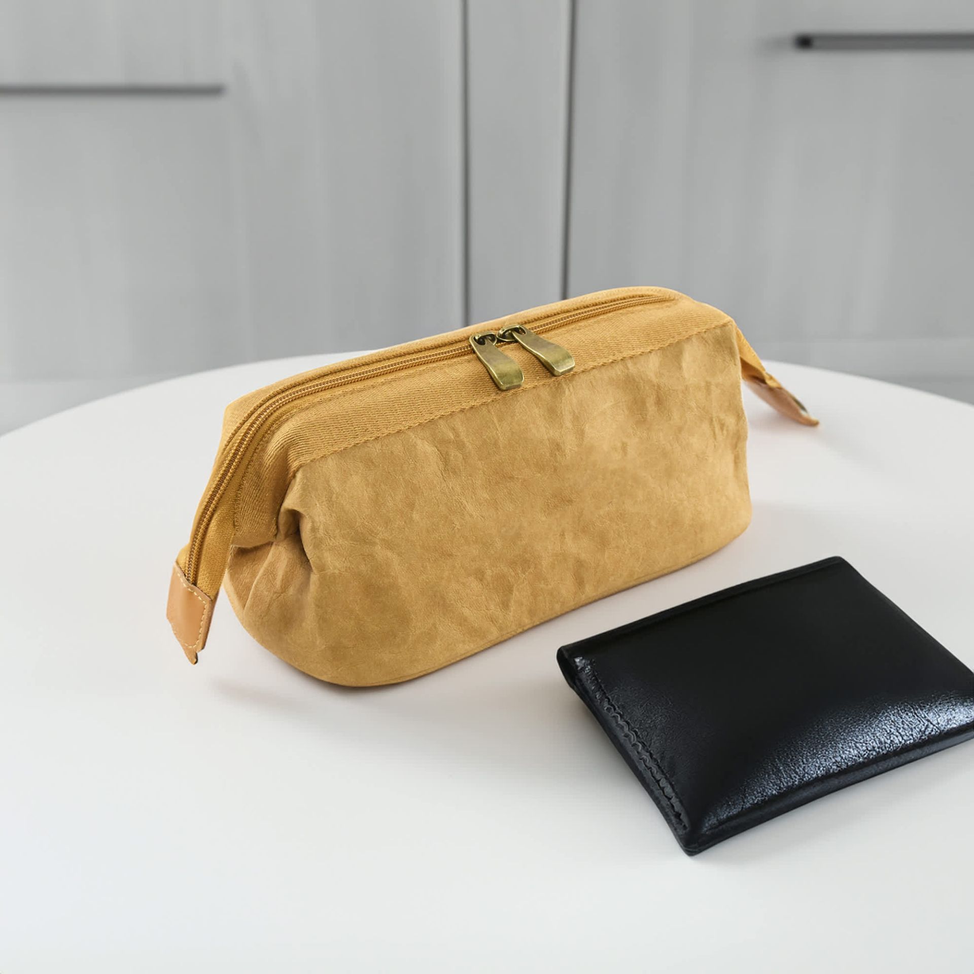 Shanklin Kraft Paper Cosmetic Bag is manufactured from German 0.55mm kraft paper designed to keep your cosmetics organized and easily accessible. The use of washable kraft paper gives it a unique and natural look while the gray canvas lining adds durability and protection. The double brown metal zipper pullers enhance the bag's aesthetic appeal and functionality. With its spacious size and reliable zipper closure along with the inside zipper pocket this cosmetic bag is a practical and stylish companion for organizing and carrying your essential cosmetics and toiletries in a neat and organized manner. Whether you're traveling or using it daily this bag is a reliable choice to keep your cosmetics safe and in order.