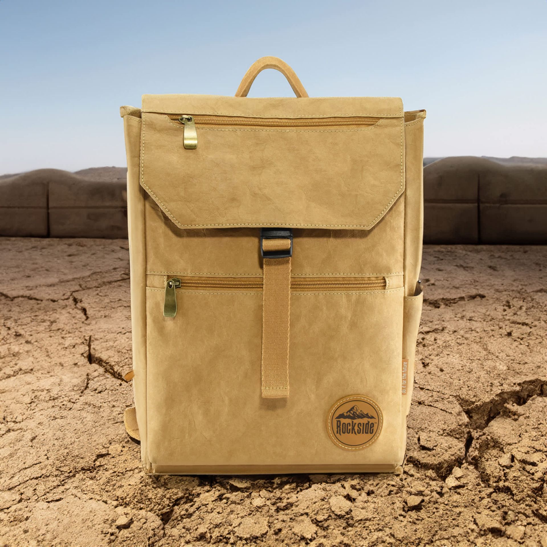 This backpack is designed to be durable stylish and highly functional making it a great choice for various activities. The combination of washable kraft paper and canvas materials gives it a unique and modern appearance while the multiple pockets and compartments offer ample storage options for your belongings. It is manufactured from German 0.55 pre-washed brown washable kraft paper with gray canvas inner lining. Features top zip closure polyester cotton webbing handle adjustable brown canvas shoulder strap and multiple pockets such as: a zip pocket on lid front and right side and one bottle pocket on the right side. It also has a laptop compartment and one zip pocket 2 open pockets inside the bag.
