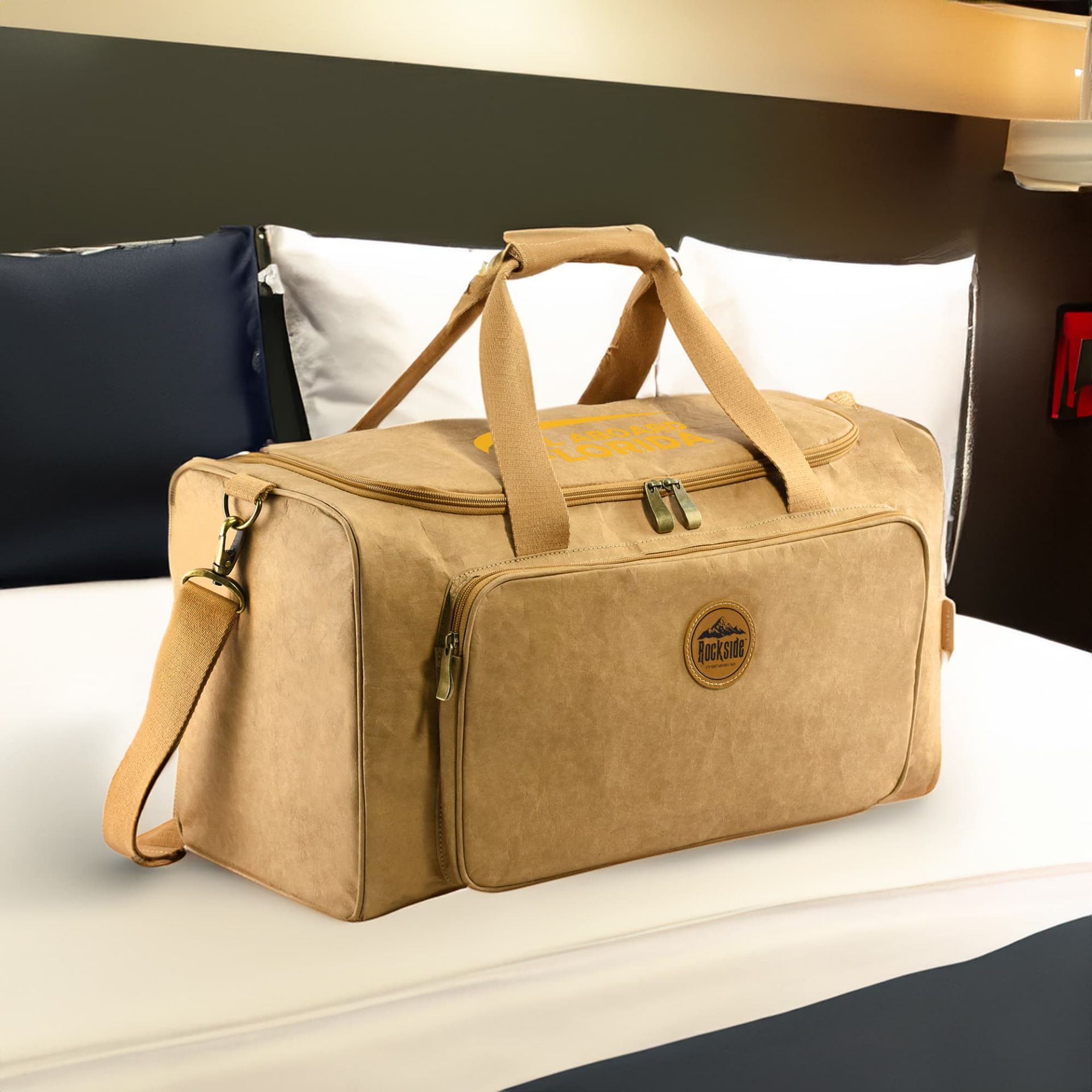 Travo Kraft Paper Duffle Bag combines durability functionality and style making it an ideal companion for short trips or weekend getaways. The use of German 0.55mm washable kraft paper gives it a unique and modern look while the brown polyester cotton webbing handles and shoulder strap add both comfort and style. The various exterior and interior pockets provide ample storage options and easy access to essentials. With its spacious design and practical features this weekend bag is a versatile and stylish choice for travel or leisure activities.